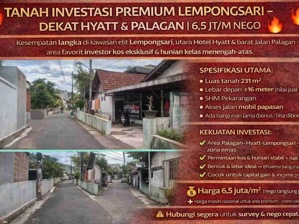Kesempatan langka di kawasan elit Lempongsari, utara Hotel Hyatt & barat Jalan Palagan — area favorit investor kos eksklusif & hunian kelas menengah-atas.