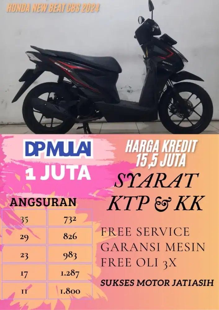 - Rp 15.500.0002024HONDA NEW BEAT CBS 2024Cicilan Rp 826 rb/blnEstimasi Perhitungan KreditDown PaymentRp 1.000.000CicilanRp 826.000 x 29 BulanKembangan, Jakarta Barat23 Sep