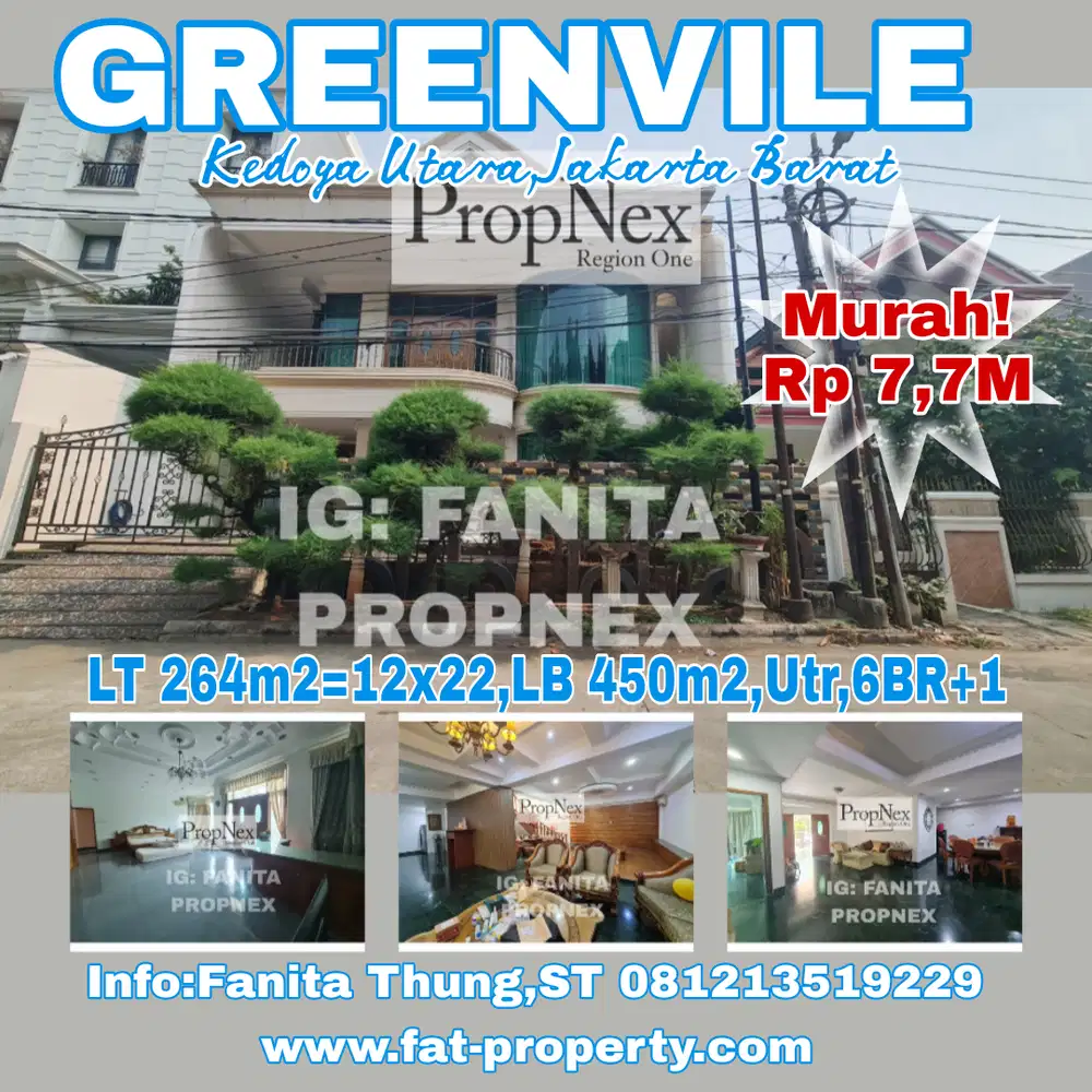 - Rp 7.700.000.0007 KT - 6 KM - 450 m2Dijual rumah mewah di Greenville,Kedoya Utr,JakBar LT 264m2=12×22,Kebon Jeruk, Jakarta Barat12 Sep
